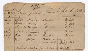 Sturgis’ account includes very little of the above context, most of which comes from a memoir written years later by Charles Loring. In his description of the Eliza’s 1799 voyage, Sturgis provides a list of every American ship present in the area during that season’s trade, her captain, and the total number of furs she accumulated by the end of the year. He also provides a grand total of furs gathered and the average price at which they sold, along with a list of the most popular goods up for barter. In 1799, for example, a total of 11,000 furs were gathered by the seven ships, which sold in Canton for an average of $25 apiece. That year, the traders bartered blue and red broadcloth, muskets, gunpowder, greatcoats, dye, and coarse cutlery in exchange for the furs. Every year’s account starts the same, and it is easy to gauge the steady growth of the fur trade overtime given these numbers. By 1802, the total number of furs gathered grew to 14,000, but they sold for only $20 apiece.