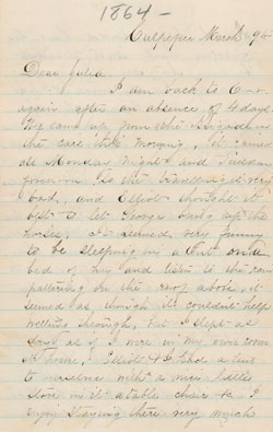 In the opening pages of this letter, the first he had written since early April, Briggs discusses General Edward E. Potter's three-week raid aimed at destroying railroads as well as rolling stock, war supplies, and cotton that had been stockpiled in remote areas of South Carolina. On 21 April, Briggs accompanied General Potter to Millford Plantation, the home of former South Carolina Governor John Laurence Manning, in search of supplies for his wounded men. Struck by the architecture and "charmingly picturesque" approach to the house, Briggs comments on the clothing and appearance of the Manning family, particularly the "imperious" Mrs. Manning, who wore "flowing black robes."