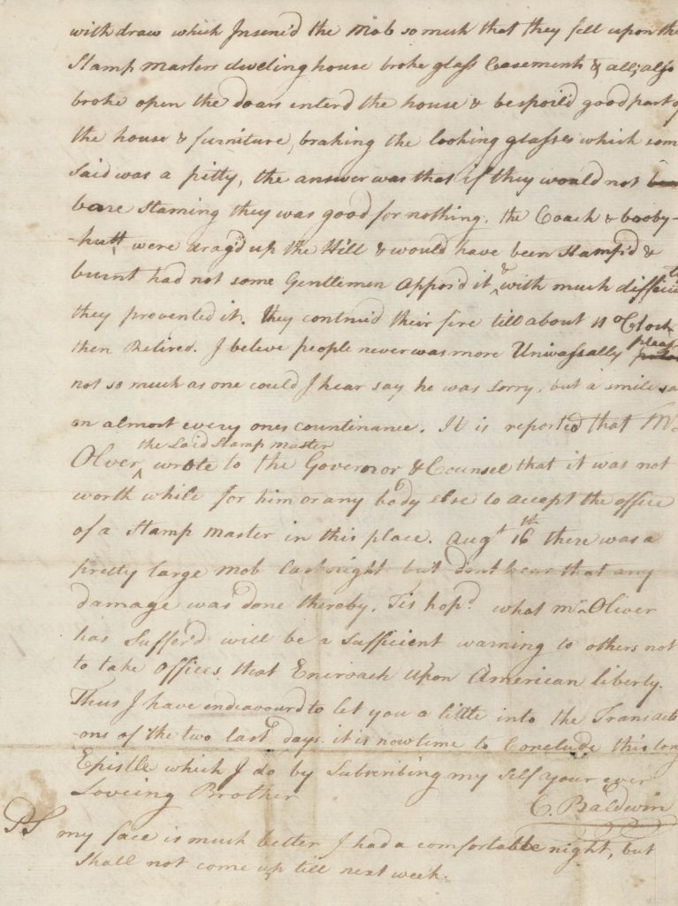 The rest of the story is best told by two witnesses to the event. In the first example, Cyrus Baldwin wrote to his brother on 15 August, informing him of the date of his upcoming visit and included news of the previous night’s protest. He personally witnessed it, or at least, the end of the evening’s mob rioting. In the second account, John Rowe, a loyalist, tells the story as heard from a secondary source.