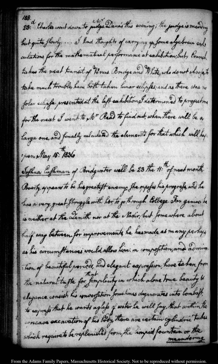 View full, authoritative transcriptions with page images of the diaries at John Quincy Adams Digital Diary part of the Primary Source Cooperative at the MHS.