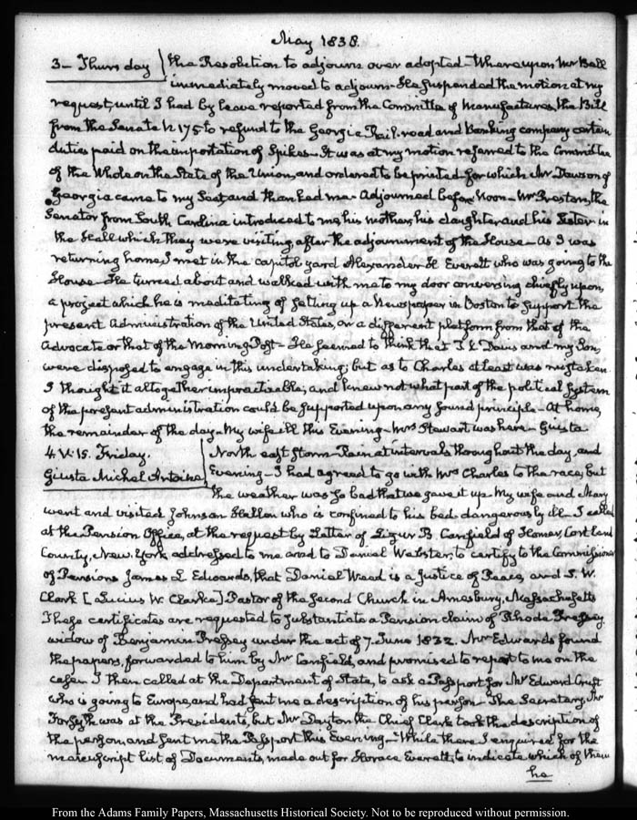 View full, authoritative transcriptions with page images of the diaries at John Quincy Adams Digital Diary part of the Primary Source Cooperative at the MHS.