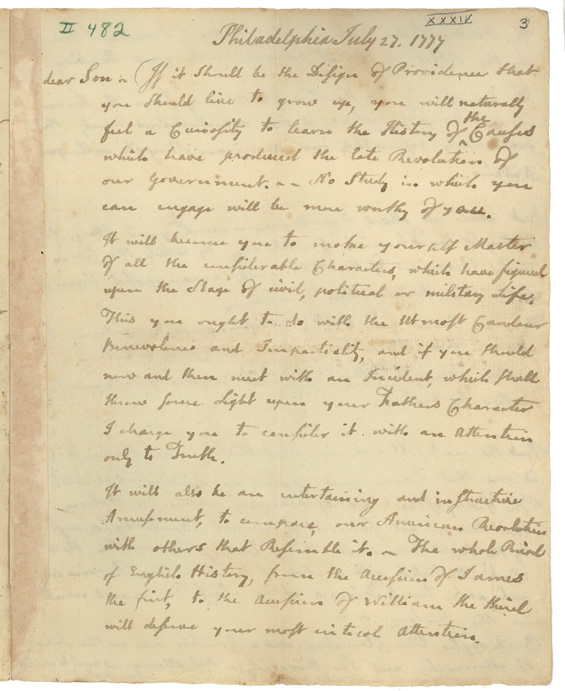 If it should be the Design of Providence that you should live to grow up, you will naturally feel a Curiosity to learn the History of the Causes which have produced the late Revolution of our Government. No Study in which you can engage will be more worthy of you.