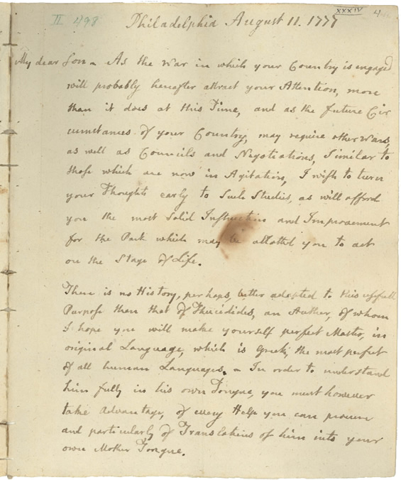 Adams, John. Letter to John Quincy Adams, August 11, 1777. Adams Family Papers, Massachusetts Historical Society. Published in Adams Family Correspondence, Volume 2: June 1776 - March 1778 (Cambridge: The Belknap Press of Harvard University Press, 1963). Pages 307-308.