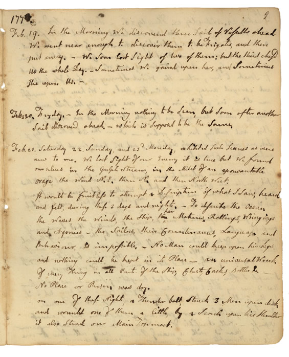 Exhibited such Scænes as were new to me. We lost Sight of our Enemy it is true but We found our selves in the Gulph Stream, in the Midst of an epouvantable Orage, the Wind N.E. then N., and then North West.