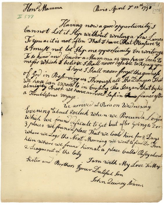 John Quincy. Letter to Abigail Adams, April 12, 1778. Adams Family Papers,