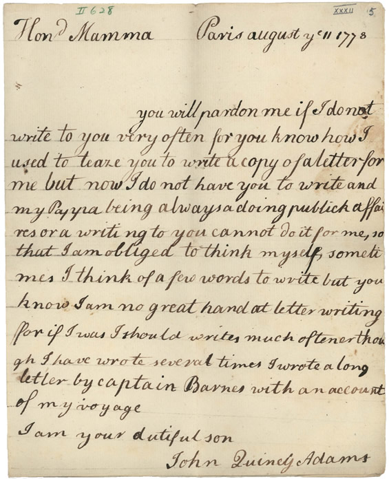 John Quincy. Letter to Abigail Adams, August 11, 1778. Adams Family Papers,