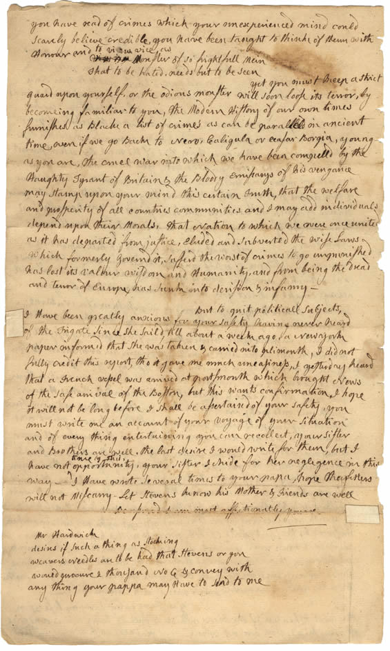 Yet you must keep a strict guard upon yourself, or the odious monster will soon loose its terror, by becomeing familiar to you. The Modern History of our own times furnishes as Black a list of crimes as can be paralleld in ancient time, even if we go back to Nero, Caligula or Ceasar Borgia. Young as you are, the cruel war into which we have been compelld by the Haughty Tyrant of Britain and the Bloody Emissarys of his vengance may stamp upon your mind this certain Truth, that the welfare and prosperity of all countries, communities and I may add individuals depend upon their Morals. That Nation to which we were once united as it has departed from justice, eluded and subverted the wise Laws which formerly governd it, sufferd the worst of crimes to go unpunished, has lost its valour, wisdom and Humanity, and from being the dread and terror of Europe, has sunk into derision and infamy.