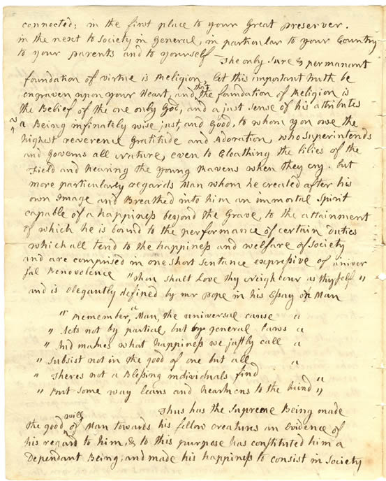 The only sure and permanent foundation of virtue is Religion. Let this important truth be engraven upon your Heart, and that the foundation of Religion is the Belief of the one only God, and a just sense of his attributes as a Being infinately wise, just, and good, to whom you owe the highest reverence, Gratitude and Adoration, who superintends and Governs all Nature, even to Cloathing the lilies of the Field and hearing the young Ravens when they cry, but more particularly regards Man whom he created after his own Image and Breathed into him an immortal Spirit capable of a happiness beyond the Grave, to the attainment of which he is bound to the performance of certain duties which all tend to the happiness and welfare of Society and are comprised in one short sentance expressive of universal Benevolence, "Thou shalt Love thy Neighbour as thyself" and it elegantly defined by Mr. Pope in his Essay on Man