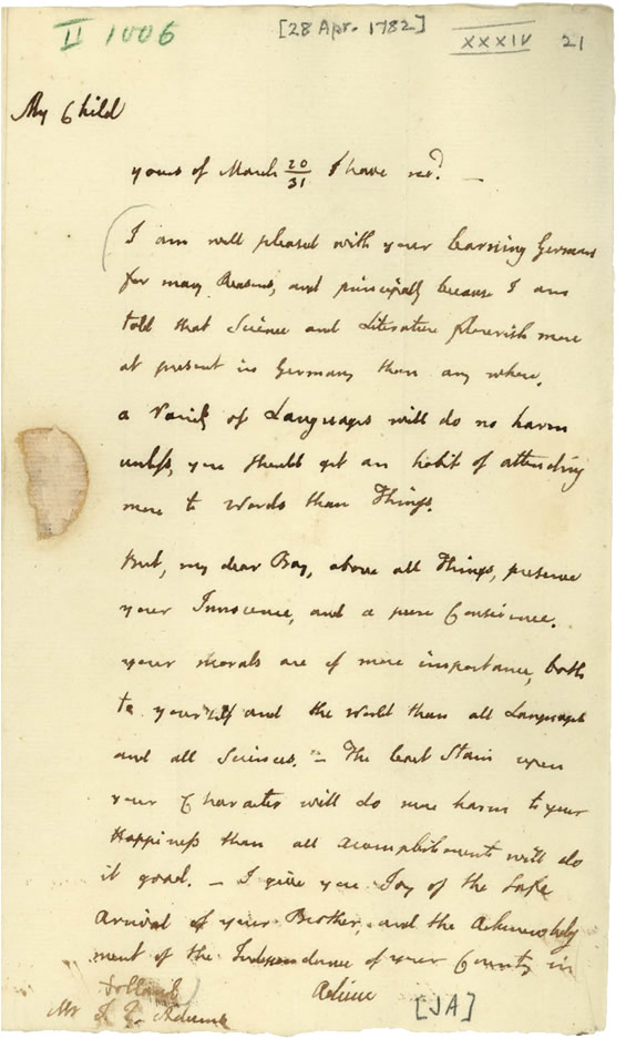 John. Letter to John Quincy Adams, [April 28, 1782]. Adams Family Papers,
