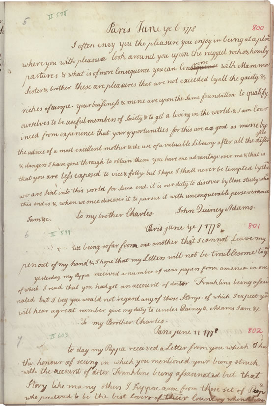 John Quincy. Letter to Charles Adams, June 6, 1778. Adams Family Papers,