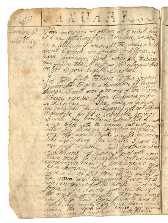 In the first volume of this journal I promised to give a description of several things. I will now give one of the Roads, Houses, men, &c from Corunna as far as this place. The roads in General are very bad. The Lodgings I will not attempt to describe for it is impossible. However I will say something about them. We did not once lodge with the mules but not much better. They shew us chambers in which any body would think a half a dozen hogs had lived there six months. I have in my first volume said something about Castellano. We have not met with any place quite so bad as that but we have come very near it. Sometimes we might see a chimney but it is very seldom. They have a large flat stone in the middle of the room and they punch two or three holes in the roof of the house out of which some of the Smoke goes and the rest must be borne with. They never wash nor sweep their floors from the time the houses are made to the time they are pull'd down. The roofs of the houses are generally a parcel of boards cover'd with straw.