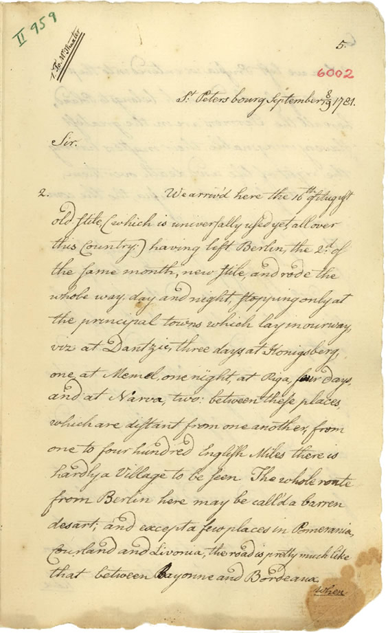 We arriv'd here the 16th of August old stile, (which is universally used yet, all over this Country;) having left Berlin, the 2d. of the same month, new stile, and rode the whole way, day and night, stopping only at the principal towns which lay in our way, viz: at Dantzic, three days, at Konigsberg, one, at Memel, one night, at Riga, four days, and at Narva, two: between these places, which are distant from one another, from one to four hundred English Miles there is hardly a Village to be seen. The whole route from Berlin here may be call'd a barren desart; and except for a few places in Pomerania, Courland and Livonia, the road is pretty much like that between Bayonne and Bordeaux.