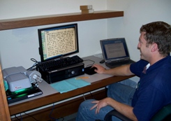 We’ve recently acquired three wonderful new microfilm reader/scanners, and they’re receiving rave reviews from staff and readers alike (research fellow Matt Bahar, pictured here, has been making good use of one in recent days), and other library visitors have been tossing around some pretty impressive superlatives about them (by which I mean positive superlatives, which was not usually the case with the previous readers).