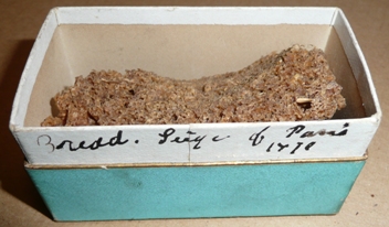 But we do have a piece of petrified bread said to be from the Siege of Paris, 1870-1871. This is among historian Francis Parkman’s assorted memorabilia removed from the study in his Jamaica Plain home, and came with other Parkman artifacts as a gift of the Colonial Society of Massachusetts, 16 January 1984. And here it is: