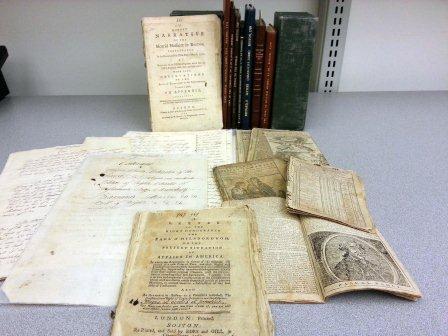 We do not know when this happened, but the volumes were disbound at some point for, among other reasons, preservation. As part of this process, the pamphlets originally collected by Dorr for Volumes Two and Three were removed and added to the Society’s general collection of printed materials. These two volumes came to the MHS in 1798 and have been in use for more than 210 years. This means there is a long period of time in which some of the documents Dorr collected may have been separated and moved around. In 2011, the MHS acquired the fourth volume of Dorr’s Annotated Newspapers via auction. Working at the MHS when this fourth volume arrived, and seeing how it looked in its original organization and binding, I became intrigued about the existence of those pamphlets that had been separated from the earlier volumes, and where they might be located within the building.
