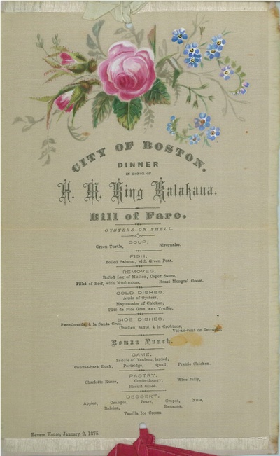 The Boston visit was strategic. New England sugar interests opposed tariff-free trade which would allow Hawaiian sugar to flood the market and overtake their business. The King’s visit fostered a cultural friendship including the lavish dinner held by the City of Boston on 2 January 1875 at the Revere House. The dinner started with oysters in true New England tradition. In fact, the City spent $3,000 in entertainment and accommodations for the royal party at the Revere House. Here is the bill of fare from the banquet in honor of King Kalakaua.
