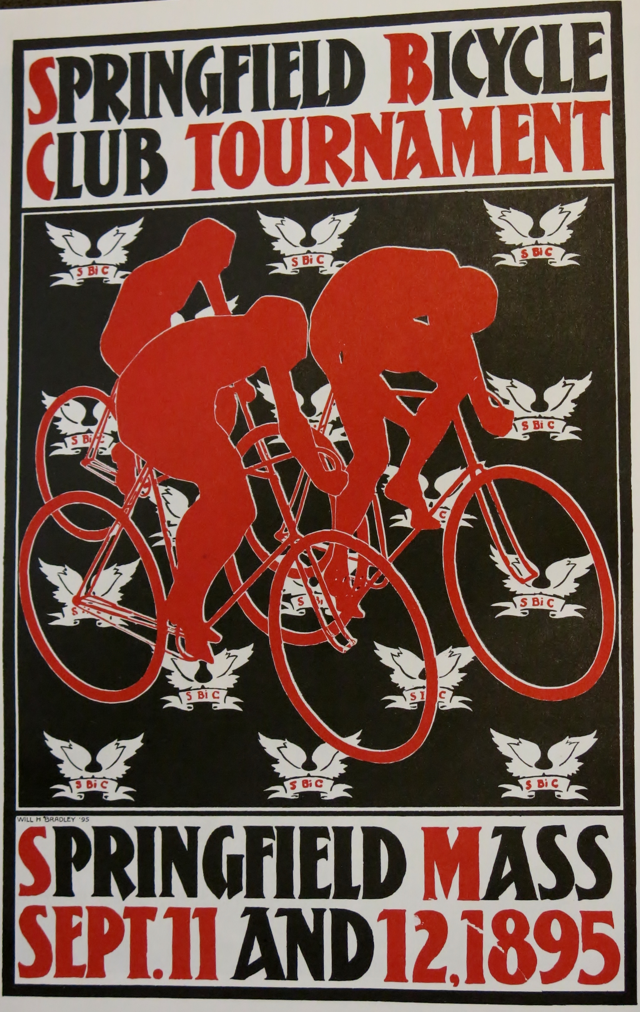 The second artist, Boston native Will H. Bradley (1868-1962), is best remembered as the “Dean of American Design.” Bradley’s Art Nouveau style widely graced the pages of commercial trade catalogs, posters, and public exhibitions through the late-19th and early-20th centuries. His career as a visual artist brought him international acclaim. He reigned in his time as the most highly-paid American artist. Recently, the MHS digtized a sample of his work for view on our website. Bradley designed and illustrated the Overland Wheel Co./Victor Bicycle catalog in 1899. Check it out here to learn more about his life and work.