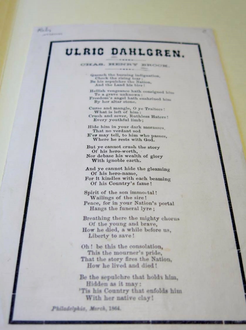 The document in the folder was “Death of the Immortal Dahlgren,” a poem by M.S.N. memorializing the death of a man described as a “Chieftain of Glory!” the “Hercules of Liberty!” whose “bold heart died to be free / Warm’d by its out-gushing flood.”