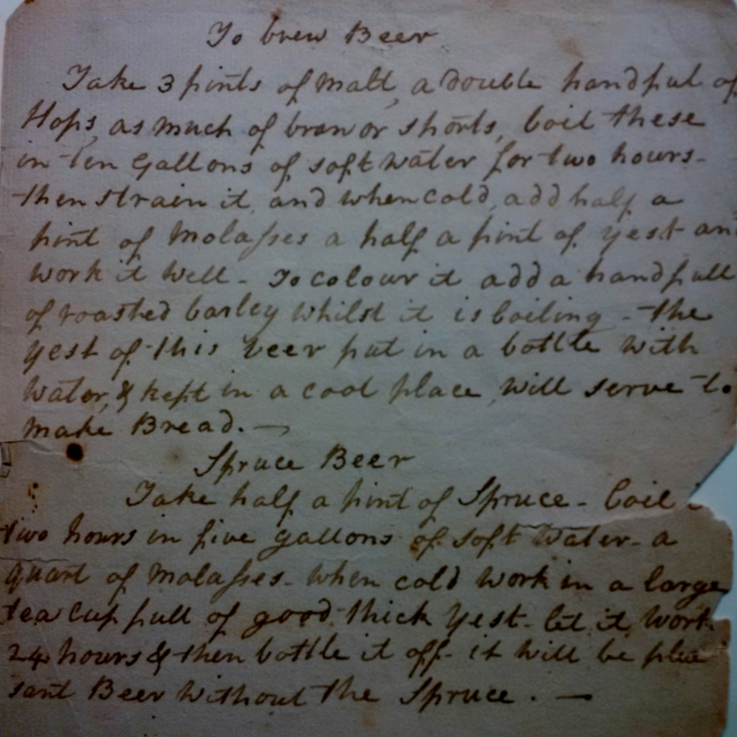“Take half a pint of Spruce. Boil it two hours in five gallons of soft water, a quart of molasses. When cold work in a large tea cup full of god thick yest, let it work 24 hours & then bottle it off. It will be pleasant Beer without the spruce.”
