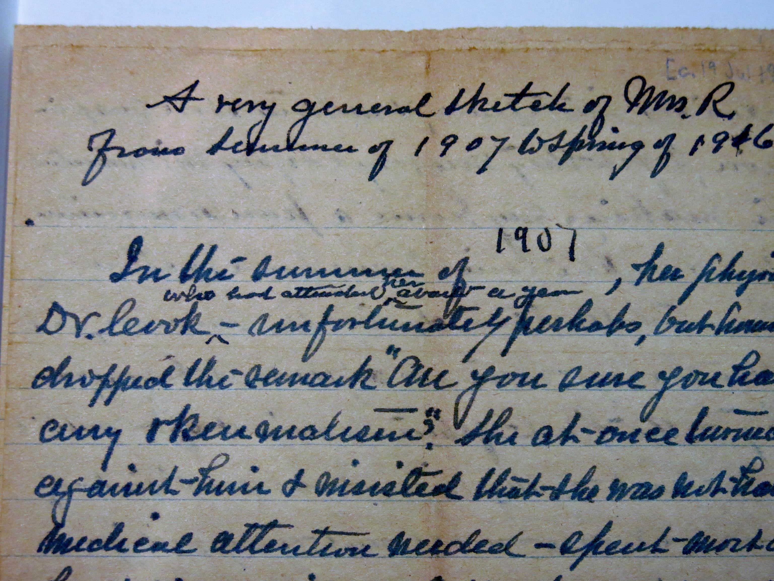 In The Mad Among Us: A History of the Care of America’s Mentally Ill, historian Gerald N. Grob writes that the late 19th– and early 20th-centuries constituted a period of challenges to and changes within the psychiatric profession. There were calls for an increasingly-scientific approach to psychiatric medicine, as well as a shift toward psychopathic hospitals rather than “traditional” mental hospitals. These new hospitals emphasized research and cared for a variety of so-called deviant individuals rather than simply long-term, chronically-ill people. However, according to John R. Sutton, rates of institutionalization remained high even with attempts at reform, in part due to new developments in the creation and management of deviance in the United States. Etta Loring Richards’ institutionalization takes place within this context. According to “A Very General Sketch of Mrs. R from the Summer of 1907 to Spring of 1916,” written by David Richards ca. 19 July 1916, Etta felt around the summer of 1907 that she could not trust anyone, and that she was not “having the medical attention she needed.” Etta was taken to Arlington Heights Sanatorium, then later to Adams Nervine. At Arlington Heights, she was diagnosed by a Dr. Ring (three Dr. Rings, two of whom are said to be affiliated with “Ring’s Sanatarium” in Arlington Heights, are mentioned on page 395 of this 1910 Medical Directory of Boston), who said of her condition: “There is nothing the matter with the woman physically, its simply Hypochondria.” After six months at Adams Nervine, Etta returned home. However, her mental health concerns reappeared in later years.