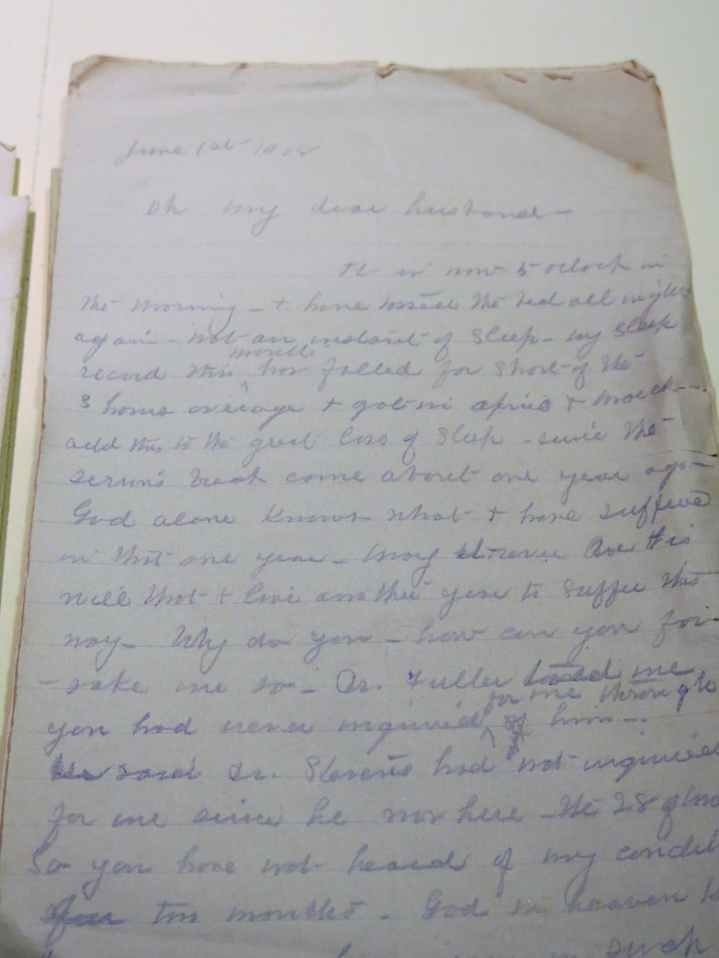 In addition to Etta’s frustration regarding David’s apparent indifference and skepticism toward her treatment, I got a sense of the loneliness Etta felt when her husband failed to give her the attention she sought while she was institutionalized. In a 1 June 1908 letter, Etta writes: