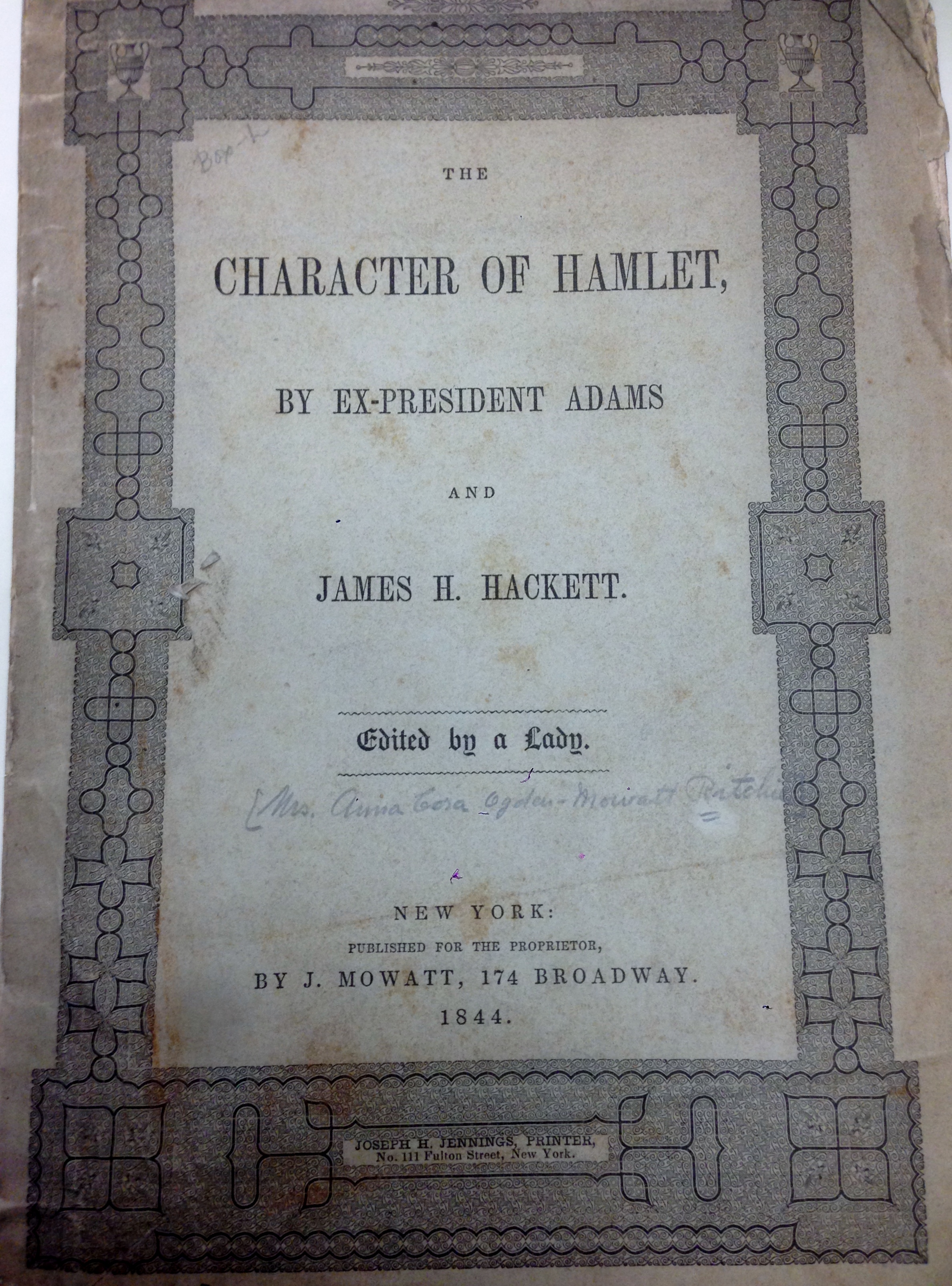 The front page of John Quincy Adams’ published interchange of correspondence with James Hackett, regarding the character of Hamlet.