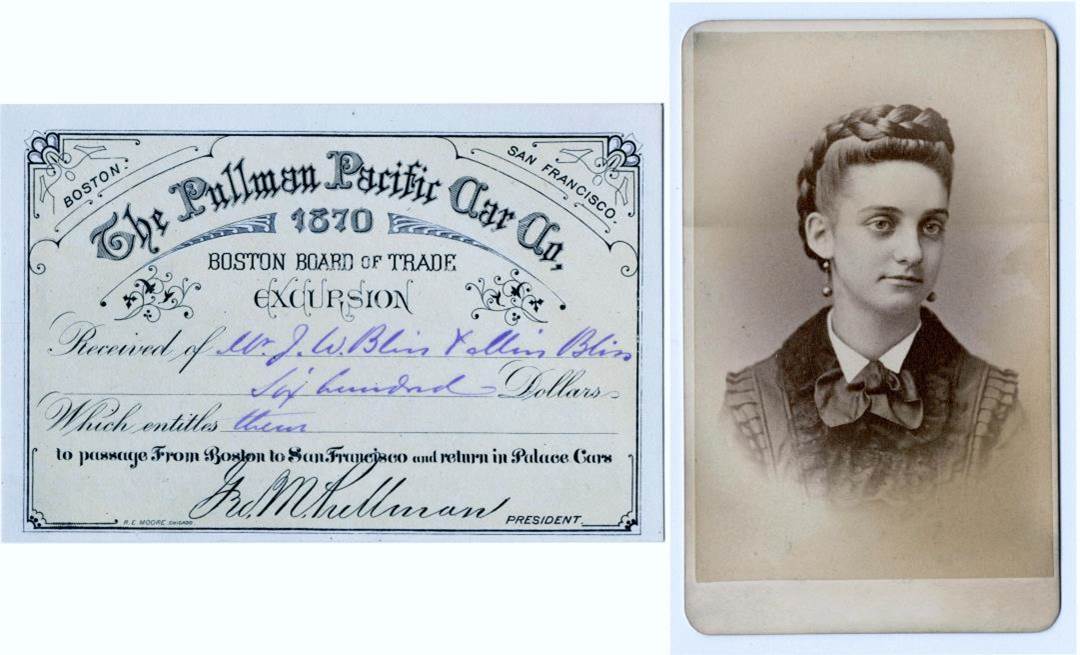 James’s train trip was luxurious. A colleague described the Pullman excursion here at the Beehive a few years ago. The MHS has also digitized a broadside about the trip, as well as the first issue of the newspaper printed on the train. You can find James and his teenage daughter Josie, who accompanied him, listed on both documents. I don’t have a picture of James, but here’s Josie, with the receipt for their fare.