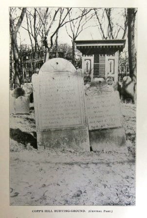 I find a visit to any of New England’s burying grounds fascinating year-round, but I consider treading among slate gravestones and timeworn monuments in October a quintessential New England experience. The leaves turn and fall, beautifully marking a transition from livelier months to the eventual stillness of winter. It’s a fitting setting to consider the lives and deaths of those memorialized on surrounding grave markers. In Historical Sketch of Copp’s Hill Burying-Ground with Descriptions and Quaint Epitaphs, published in 1909, John Norton provides an overview of Copp’s Hill in Boston and the burying ground’s gravestones. Norton begins with a history of Copp’s Hill, spanning its early days as “the North burying ground” through a time “when the well-to-do of Boston dwelt largely in the North End” to the end of the burying ground’s growth around 1832. The second half of this publication includes photographs and epitaphs of select gravestones and monuments.