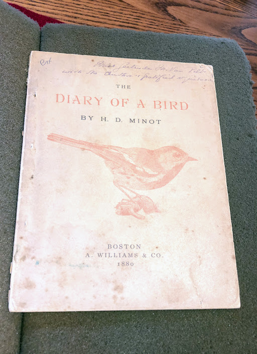 In 1880, Minot became not just an observer of birds, but an advocate for them with the publication of Diary of a Bird, Freely Translated into Human Language. In this short publication, Minot acts as “translator” for a black-throated green warbler who has kept a diary “for the purpose of amusing, instructing, and enlightening mankind,” even though the diarist claims he does not approve of the practice of diary-keeping amongst birds. The diarist does not have a name; he writes, “in a bird-community, every member is expected to know his own mate and children; beyond that, we make no distinctions . . . . I myself, for instance, have no individual name, and am very well content; for among us are no rights of property and inheritance, no law-suits, no marriage-ceremonies; but each of us lives for himself.” The warbler writes of the end of his migration from southern Mexico to the White Mountains, his mate’s efforts to build a nest and sit on their eggs, a run-in he has with a birder, and the activities of raising his family. Our feathered diarist often makes use of turns of phrase used only by birds (for instance, he once describes a lake as being “as long as the flight of a heron with thirty or more wing-beats), which Minot, as translator, helpfully explains. (Thirty heron wing-beats is about 500 feet, if you were wondering!)