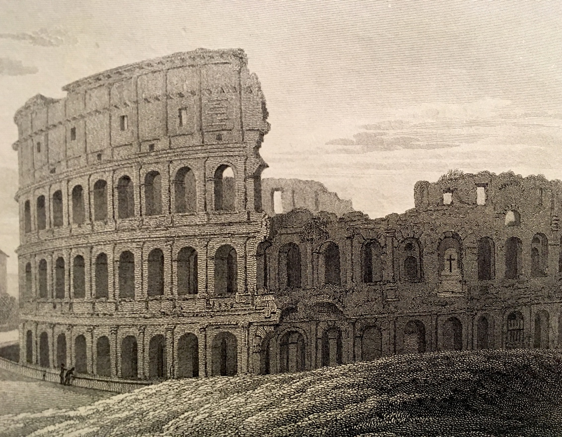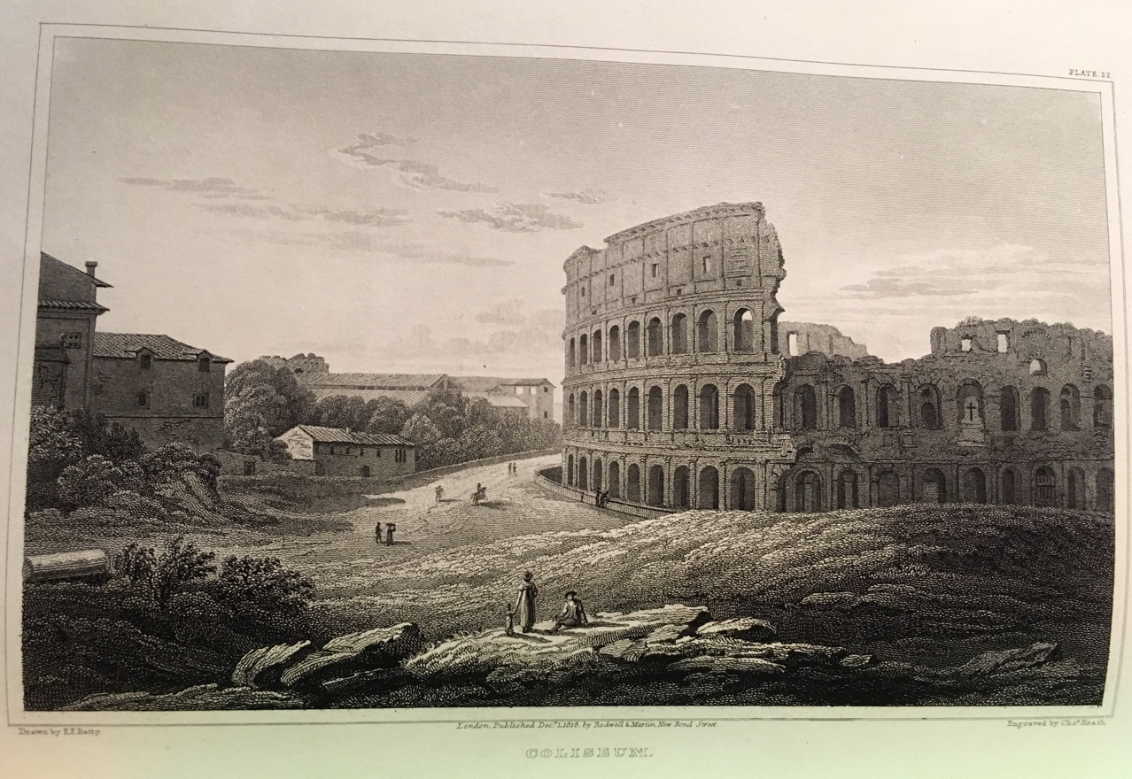 [Coliseum, p.74]. Batty, E. F. (1820). Italian scenery: from drawings made in 1817. London, England: Rodwell.[Detail of Coliseum, p.74]. Batty, E. F. (1820). Italian scenery: from drawings made in 1817. London, England: Rodwell.Accompanying the drawing of the Colosseum, is a three-page description (as there is with every other image in the book). We learn from a note at the beginning of the book that the writing was done by a friend of the publisher, although we are not told who that was.