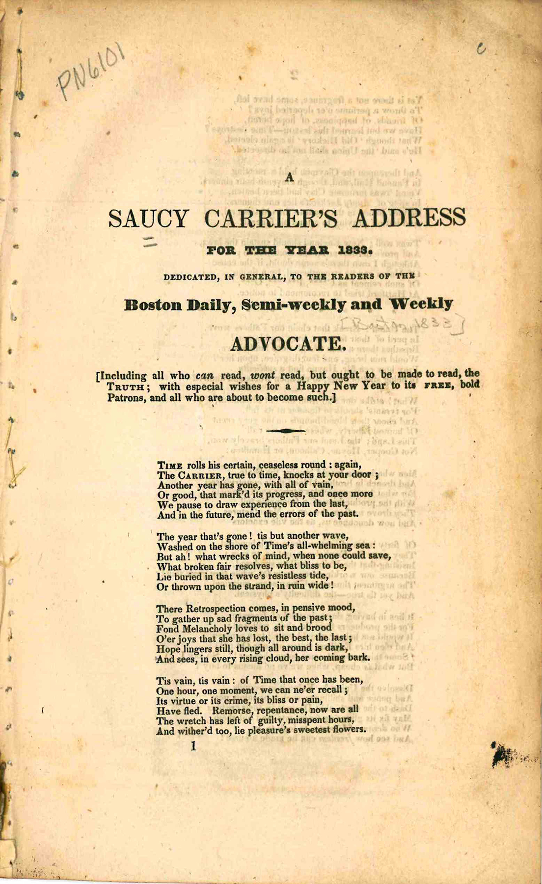 A saucy carrier’s address for the year 1833. Dedicated, in general, to the readers of the Boston daily, semi-weekly and weekly Advocate …, [Boston : s.n., 1833].Without further ado, some words of wisdom from the Saucy Carrier: