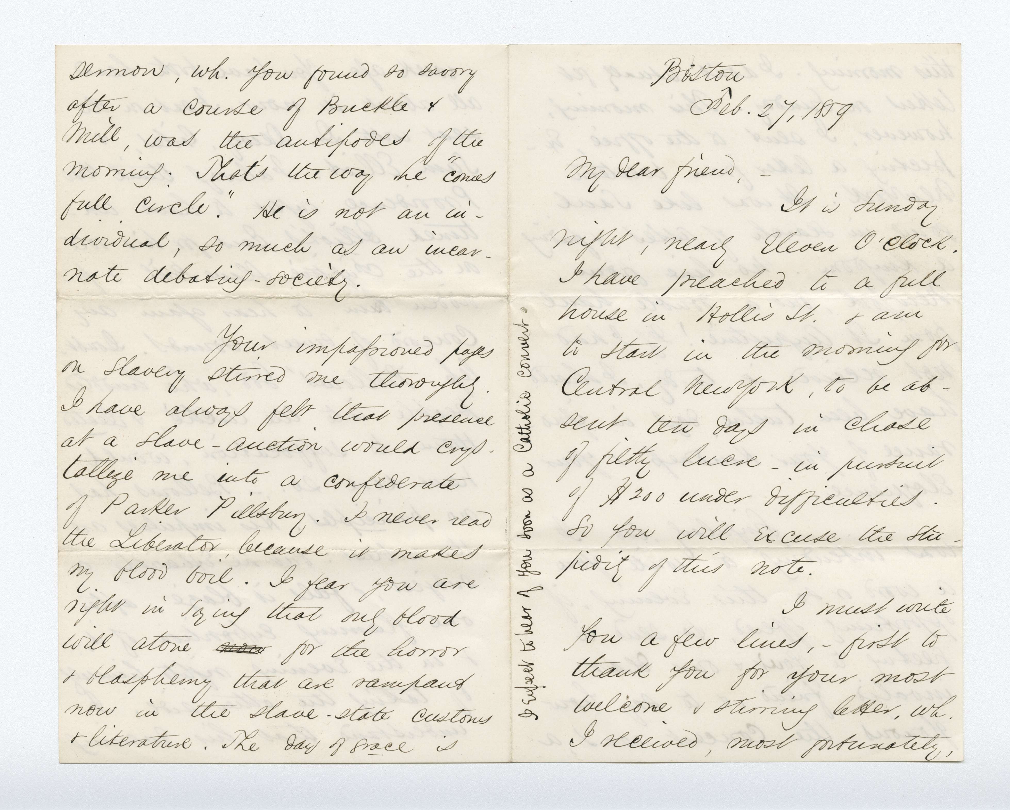 Your impassioned pages on Slavery stirred me thoroughly. I have always felt that presence at a slave-auction would crystallize me into a confederate of Parker Pillsbury. I never read the Liberator, because it makes my blood boil. I fear you are right in saying that only blood will atone for the horror & blasphemy that are rampant now in the slave-state customs & literature. The day of grace is doubtless sinned away.