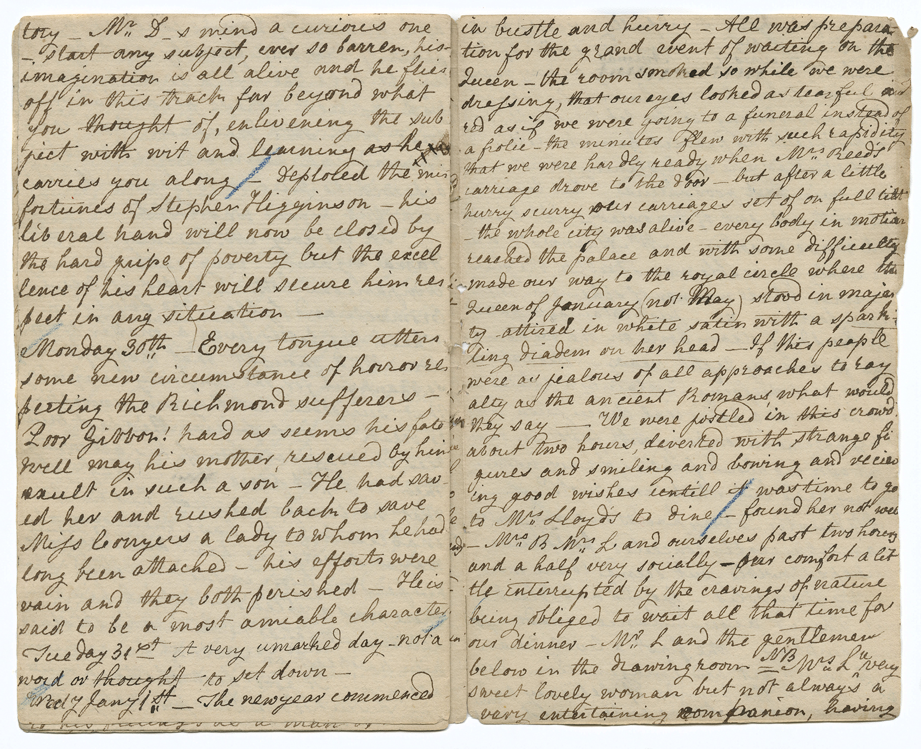 Wedy Jany 1st – The new year commenced in bustle and hurry – All was preparation for the grand event of waiting on the Queen – the room smoked so while we were dressing, that our eyes looked as tearful and red as if we were going to a funeral instead of a frolic.