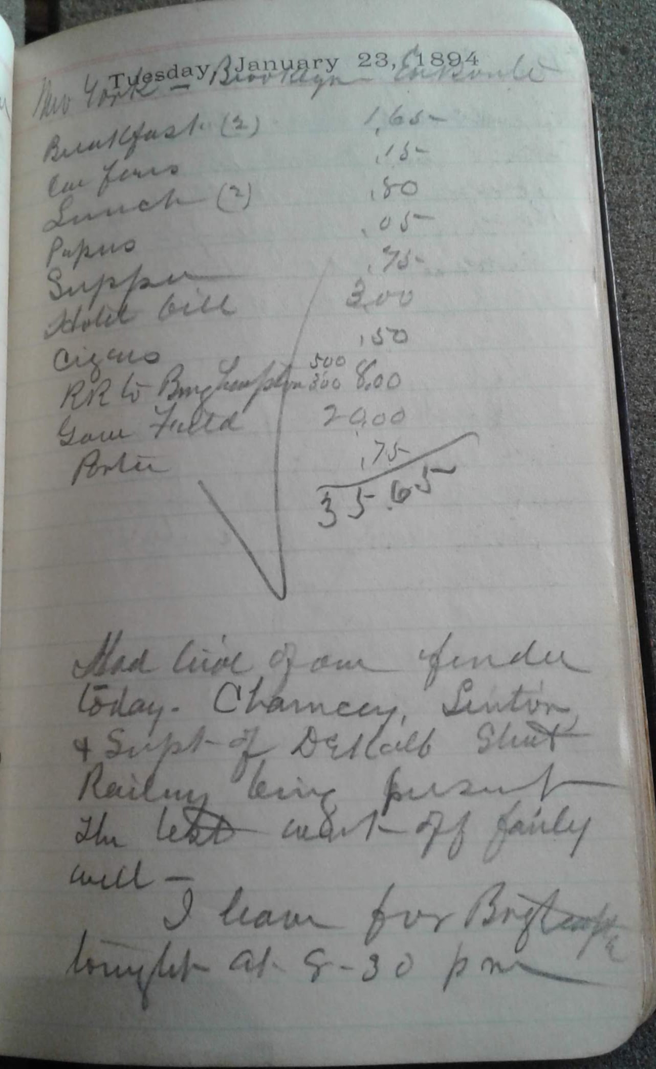 Arrived here this AM at 3-55 went to the […] Hotel. Saw Mr. G. Linny Pagus Prest. of the Binghampton Rd. Co.