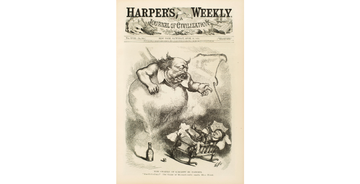 1874 cartoon displaying criticisms of Butler in caricature. “Cradle of Liberty in Danger.” Collection of the MHS.