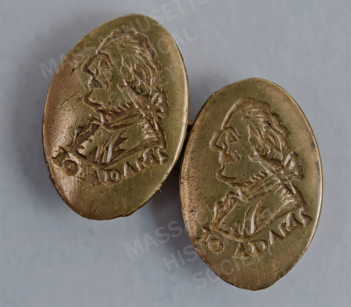 John Adams campaign token or button coat stud, [1800].He came home in a whirlwind. His “little bark…oversett in a Squal of Thunder and Lightening and hail attended with a Strong Smell of Sulphur,” outgoing President John Adams fought the five hundred miles from Washington, D.C., to his native Quincy in two weeks flat. Traveling in early March 1801 meant a rough ride. Mud inked along the new, boggy roads, pooling in deep gulches that braked Adams’ path to a crawl. No longer the kind of celebrity who drew feasts, toasts, and fêtes, Adams plodded through dreary tavern stops. Minutes after he reached Peacefield to reunite with wife Abigail and his family, a violent storm splintered the New England sky. Gales of wind shuddered across his farm. Rain whipped down, flooding crops and confining the Adamses for several days. John Adams didn’t mind. It was “So old fashioned a storm that I begin to hope that nature is returning to her old good nature and good humour and is substituting fermentations in the Elements, for revolutions in the moral intellectual and political World,” he wrote on 31 March. Turning the page on his presidency, Adams sensed greater change was in the air.