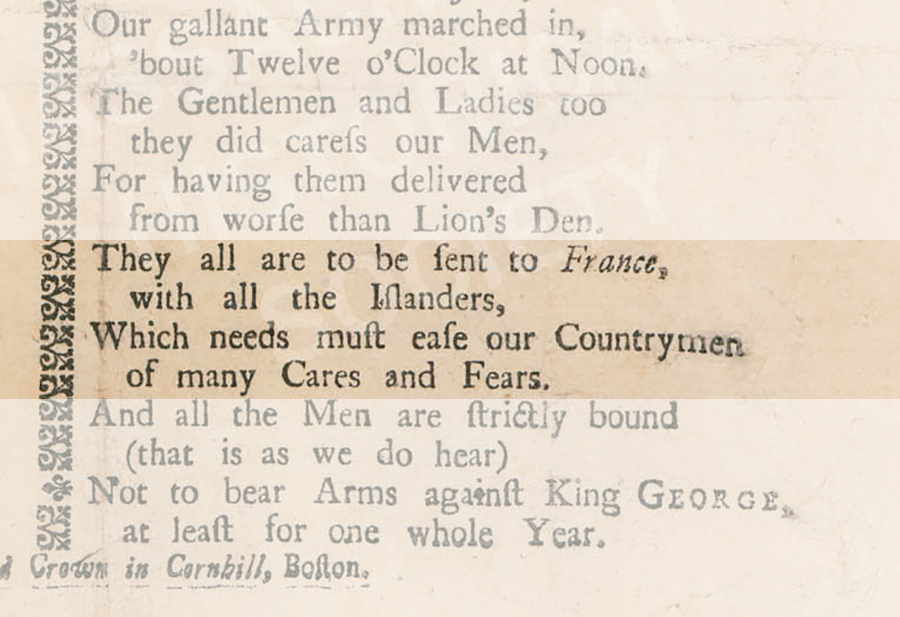 More than a thousand inhabitants of Île Royale would be deported to France in the months following the conquest of Louisbourg, though some would return home briefly in peacetime, only to be expelled again during the Seven Years War. Ultimately, more than ten thousand French-speaking inhabitants of the greater Acadian region would be forced from their homes in the 1750s-60s, a violent undertaking that historian John Mack Faragher has described as an American example of “state-sponsored ethnic cleansing.”[5] Not all New Englanders supported this cruelty. However, “New England Bravery” suggests that in 1745 there were Bostonians in favor of a forced French expulsion singing out in the streets.