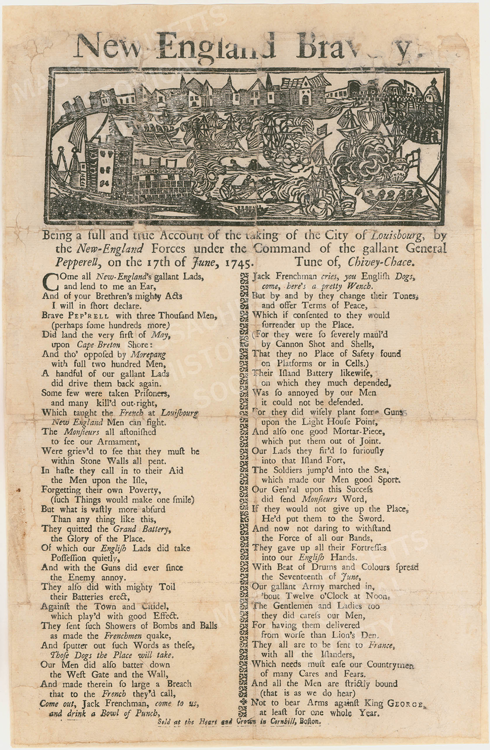 I knew that I would be able to find these answers at the MHS, which has the best collection in America on the Louisbourg expedition, including accounts of military leaders, politicians, and New England soldiers.[2] But my favorite find at the MHS was a simple printed ballad that circulated in Boston immediately following the victory. Entitled “New England Bravery,” this broadsheet describes New England’s capture of Louisbourg in verses to be sung to the tune of the old English song “Chivey Chace.” This ballad gave me not only a glimpse into the raucous celebrations that took place on Boston’s streets in July 1745, but also insight into what Louisbourg represented to the ordinary shopkeepers, merchants, and laborers who sang of its conquest. [Figure 1]