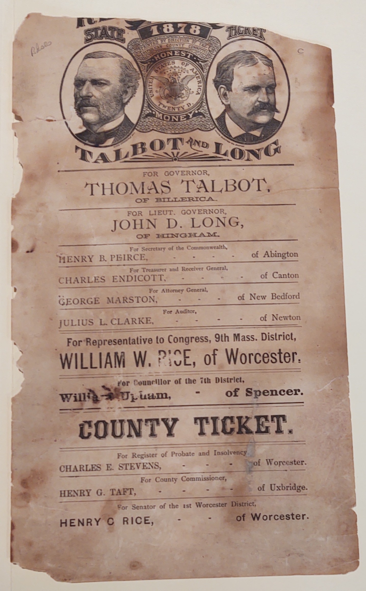 Governor Talbot’s ticket using the phrase “Honest Money” at the top. “State Ticket. 1878. Talbot and Long.” Collection of the MHS.