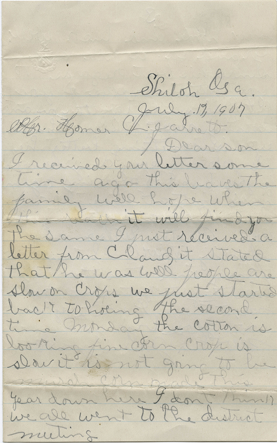 Today we return to the story of the Jarretts, a farming family in the small town of Shiloh, Georgia. The Jarrett collection at the Massachusetts Historical Society consists of five letters to Homer Clifford Jarrett (1882-1959) from family members, primarily his mother Julia. The fourth letter was written on 17 July 1907. Below is a complete transcription. As before, I’ll retain misspellings but add sentence and paragraph breaks for readability.