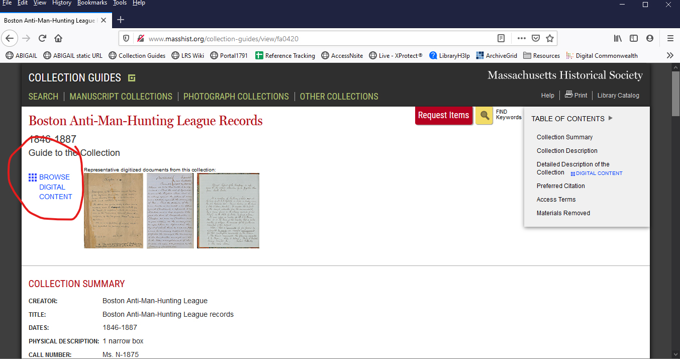Many of the MHS’ digitized collections live in our online collection guides. If you see a collection guide with a blue “Digitized Content,” you can click through to see what materials are available online.