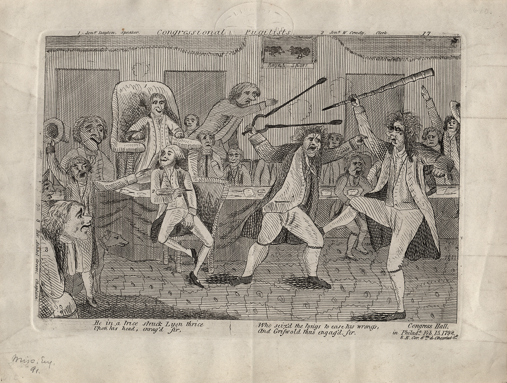 The ongoing conflict with France reinforced the party lines drawn several years earlier with Washington’s Proclamation of Neutrality. As factionalism divided Congress, partisan conflict evolved beyond balloting and policymaking. On 15 February 1798, a brawl—complete with a walking stick and fireplace tongs—broke out on the House floor. On 30 January 1798 Federalist Roger Griswold insulted Matthew Lyon’s valor during the American Revolution, after Lyon declared himself a champion of the common man and accused Griswold of corruption. Lyon, a Democratic-Republican from Vermont, spat at Griswold and was charged with gross indecency by House Federalists. However, as an outraged Abigail Adams wrote, “Instead of considering what was due to the Honour of the House, as Legislatures and as gentlemen, they have sufferd narrow party views to operate.” With Federalists unable to secure enough votes to remove Lyon, Griswold took matters into his own hands and beat Lyon with his cane; Lyon defended himself with fireplace tongs. The men later apologized and retained their seats, but the incident provides valuable insight into party conflict during the Adams presidency. The fight was instigated by disagreements over Adams’s militaristic approach to Franco-American relations and debates over which party better served American interests. According to Abigail Adams, the affair also “created more warmth, more wrath more ill will, than the most momentous questions of National concern.” Thus, while Adams despised party politics, his administration further established party identities and fostered partisan conflict so intense that it erupted in legislative violence.