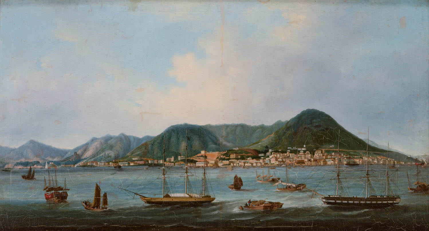 This oil painting of the harbor at Hong Kong is attributed to Lam Qua, a 19th-century artist from the Canton province in China. Also known for his portraits of Western and Chinese merchants, as well as medical subjects, Lam Qua was one of the first Chinese painters exhibited in the West. For further reading about this painting and a companion view of the Harbor of Macao, visit www.masshist.org/database/2277.