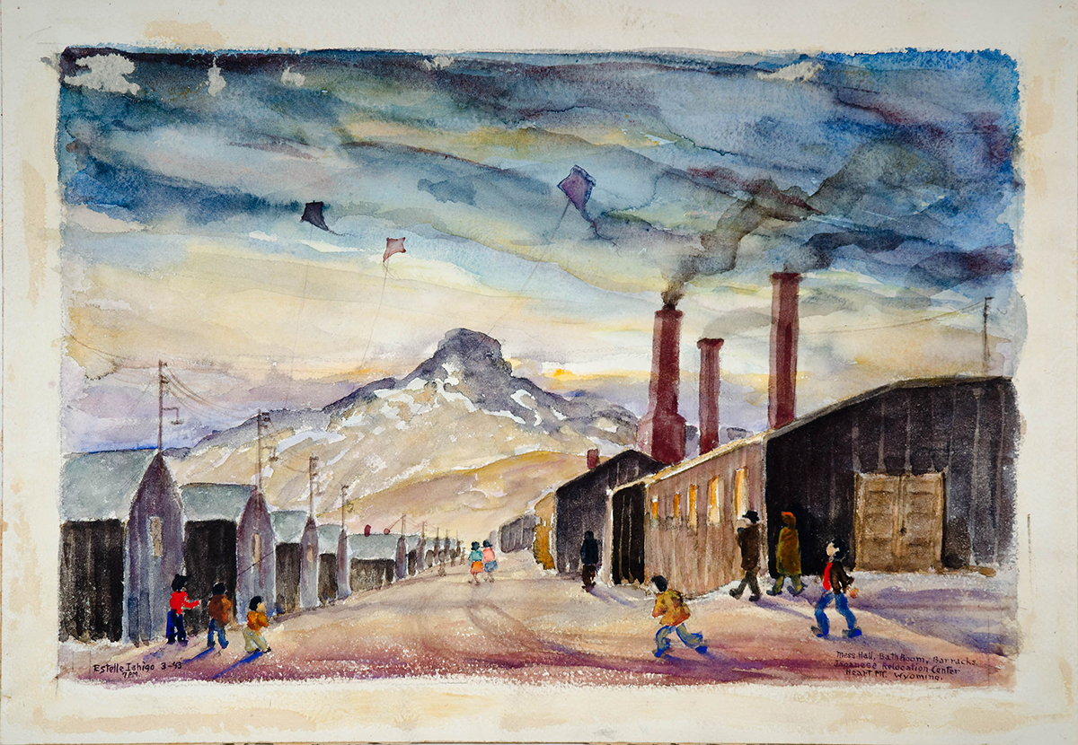 “Mess Hall, Bathroom, Barracks. Japanese Relocation Center. Heart Mt. Wyoming.” by Estelle Ishigo, March 1943, 7 P.M.