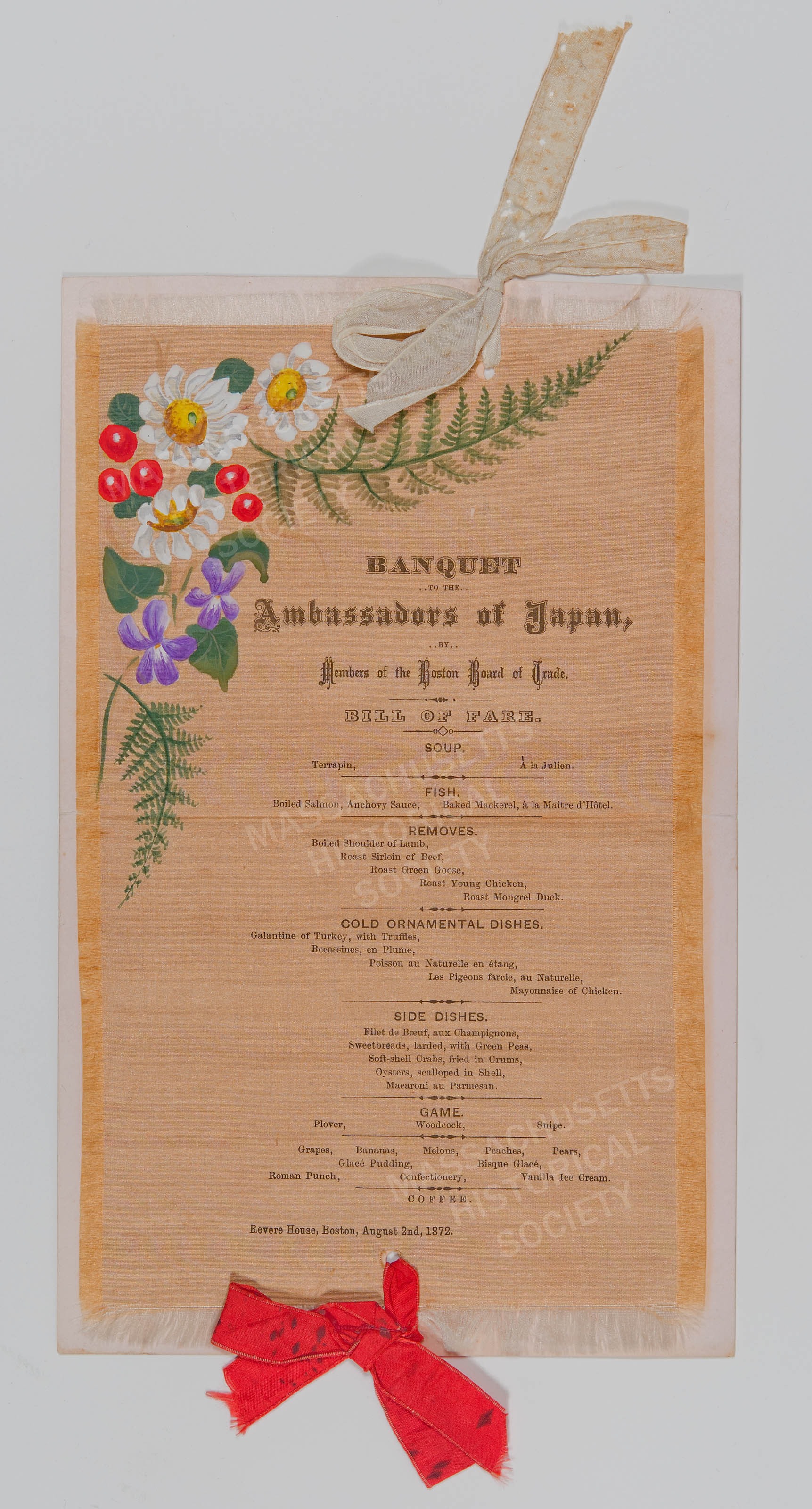 Banquet to the Ambassadors of Japan, by Members of the Boston Board of Trade: Bill of Fare, broadside on silk, 2 August 1872.