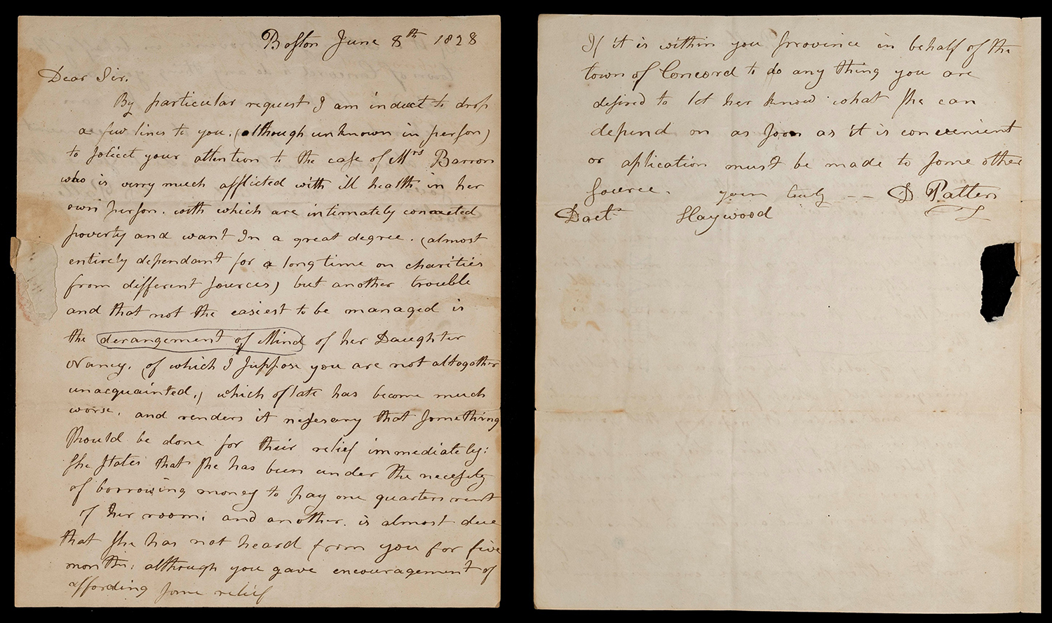 This is one of two letters written to Dr. Abiel Heywood by or on behalf of Rebecca and Nancy Barron in 1827 and 1828. The first letter, written by Rebecca Barron, describes their ill health and poverty and asks Heywood for help in paying their rent.