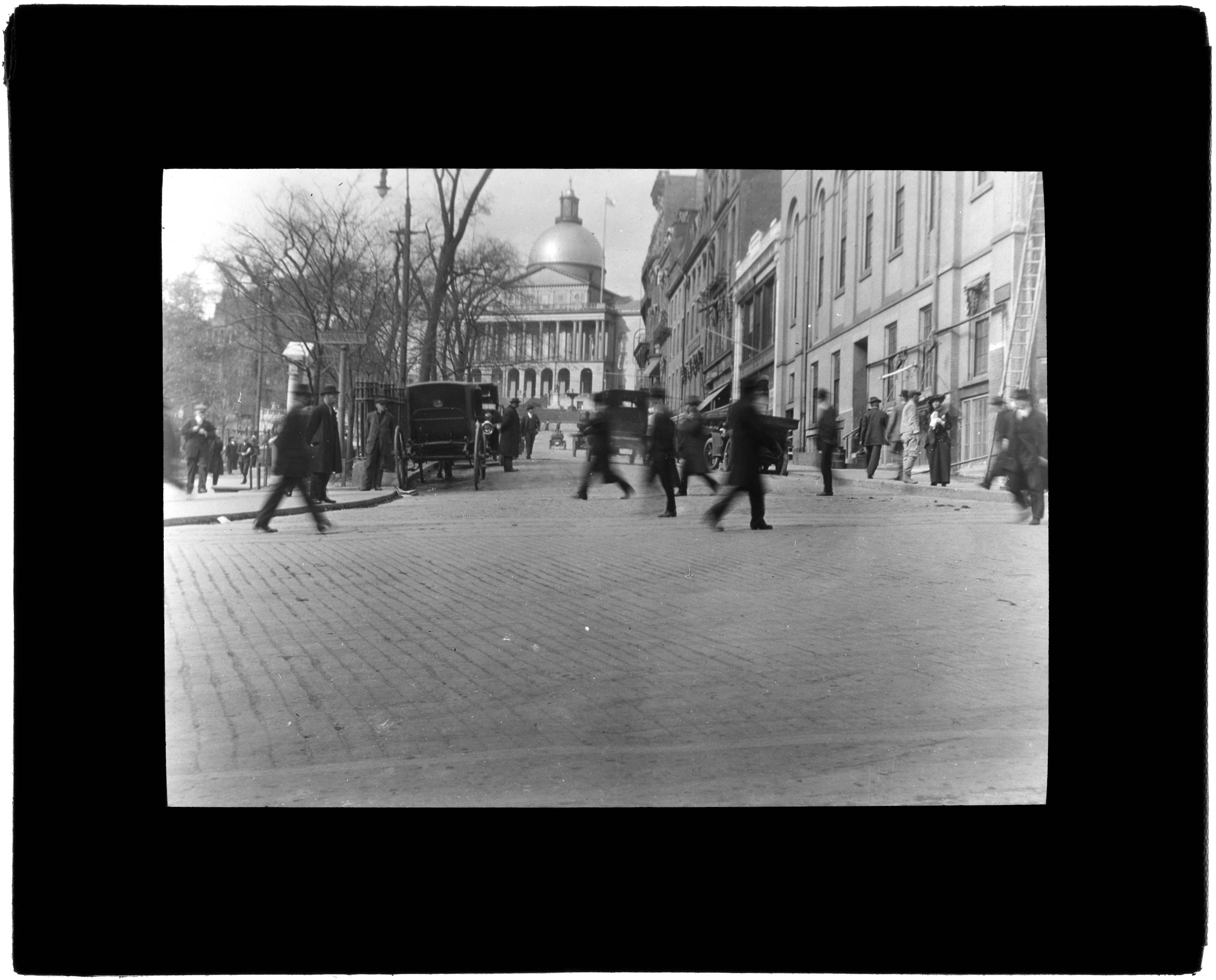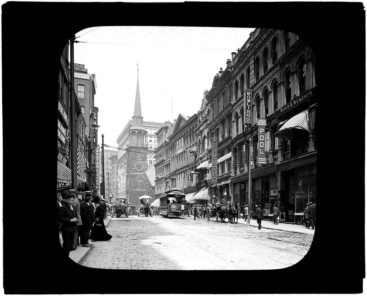 Present-day view down Washington Street towards the Old South Meeting HouseView of Scollay Square, Boston, lantern slide possibly taken by Arthur A. Shurcliff, circa 1910s.