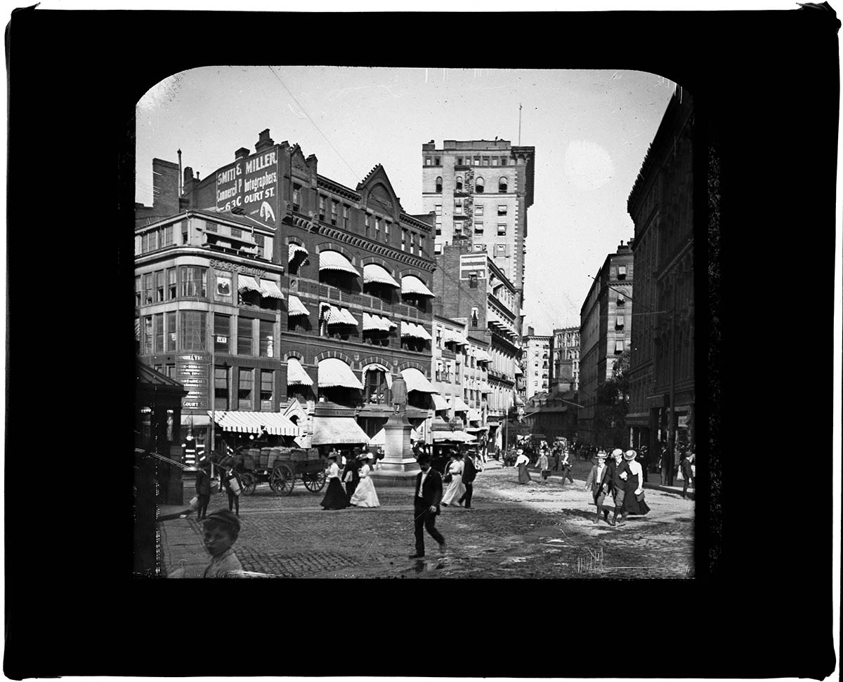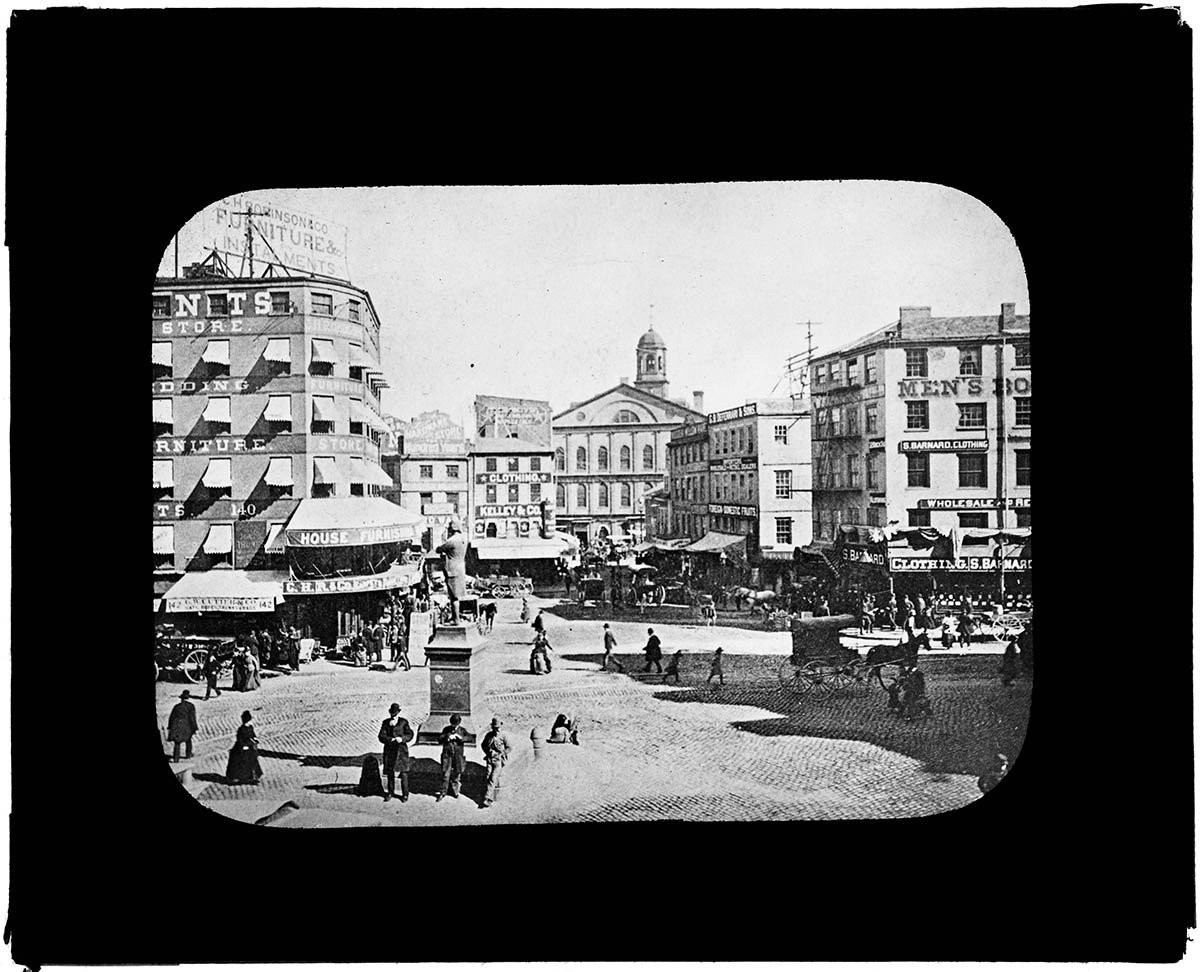View of Adams Square and Dock Square, looking north-east towards Faneuil Hall, Boston, lantern slide possibly taken by Arthur A. Shurcliff, 19th century.