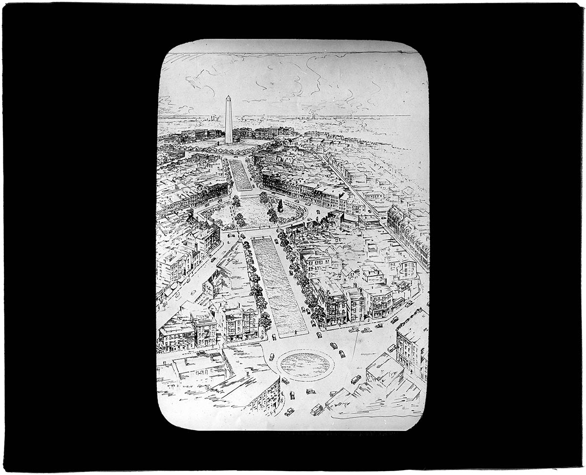 City of Boston, Park Department: Proposed Mall Connecting Chelsea Street and Bunker Hill Monument, Charlestown, Mass., lantern slide of drawing drawn by Arthur A. Shurcliff, circa 1920s.