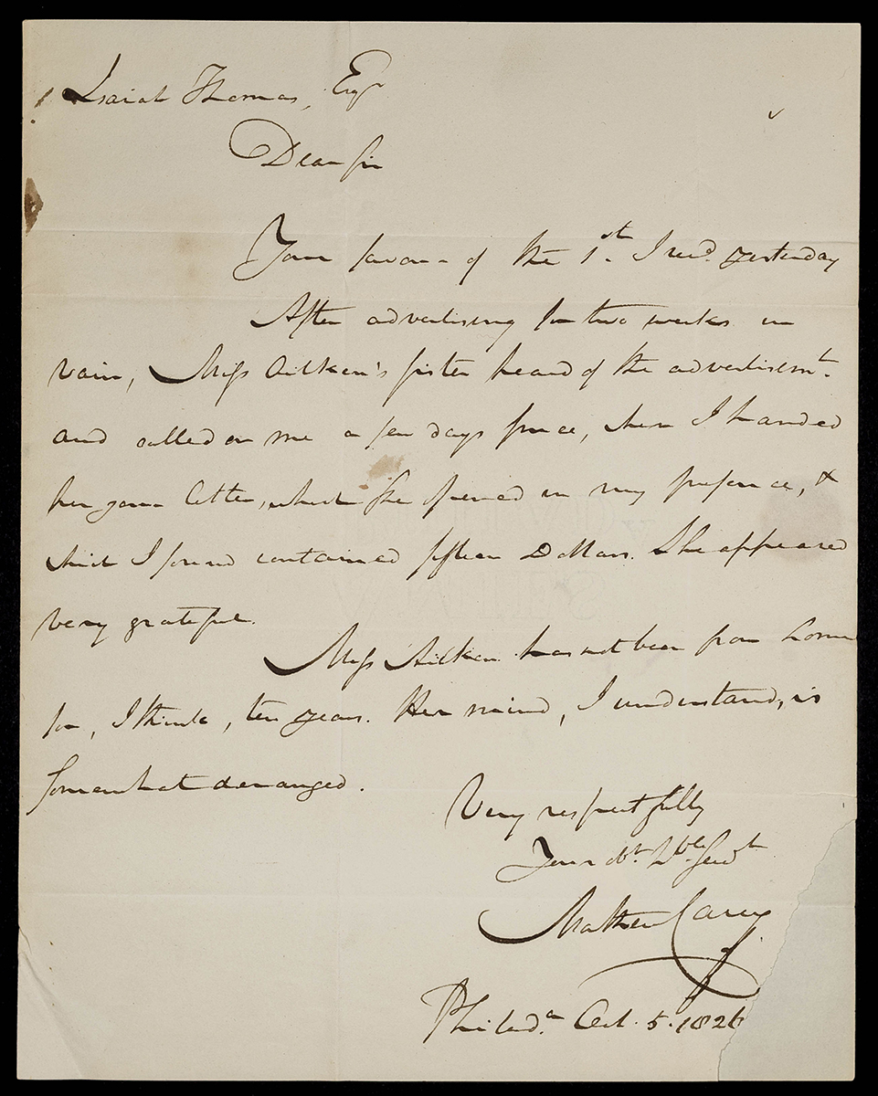 Jane Aitken was a publisher and book binder from Philadelphia. Little is known about the last decades of her life, when this letter was written.